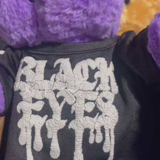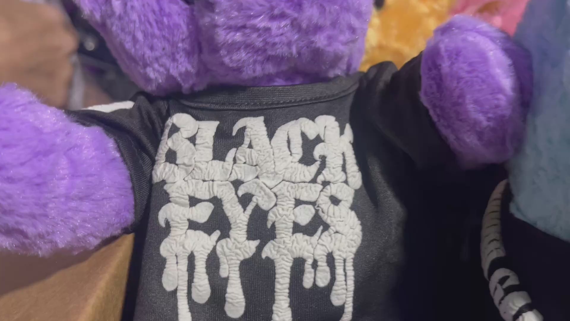These are 12” stuffed bears that have a custom Black Eyes X Morbid House glow in the dark puff shirts. Each bear will be chosen at random as there is only one color variant of each. The shirt has the Black Eyes dripping logo on the front, Black Eyes heart on the right sleeve and Morbid Gang proudly on the back. Each shirt’s design glows in the dark.