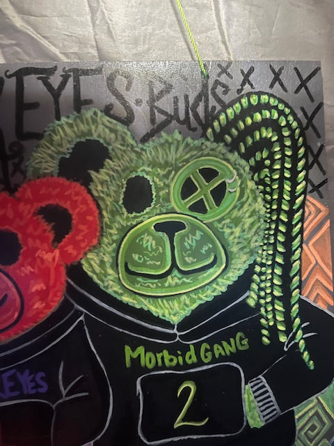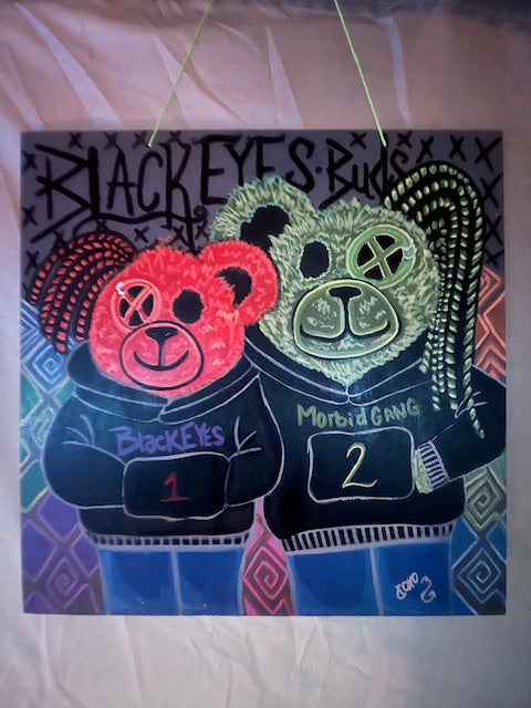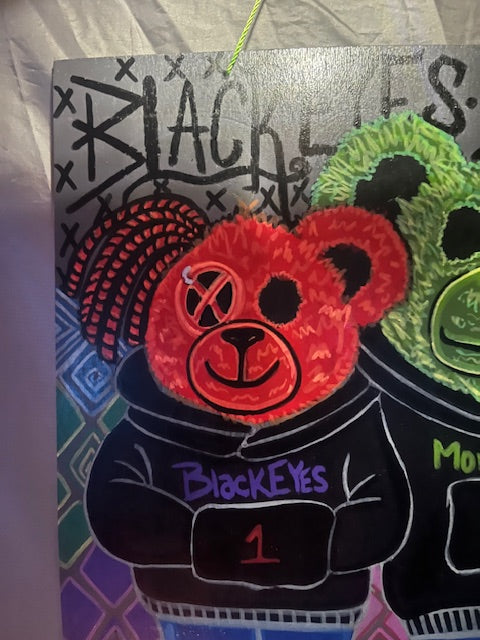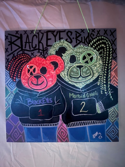 This is a one of a king painting that was the mock up idea for the Blackeyes Bears line that was just released. Three was making a beautiful and fun piece that depicts the friendship of ONE and TWO. This piece is hand signed and only one exsists.