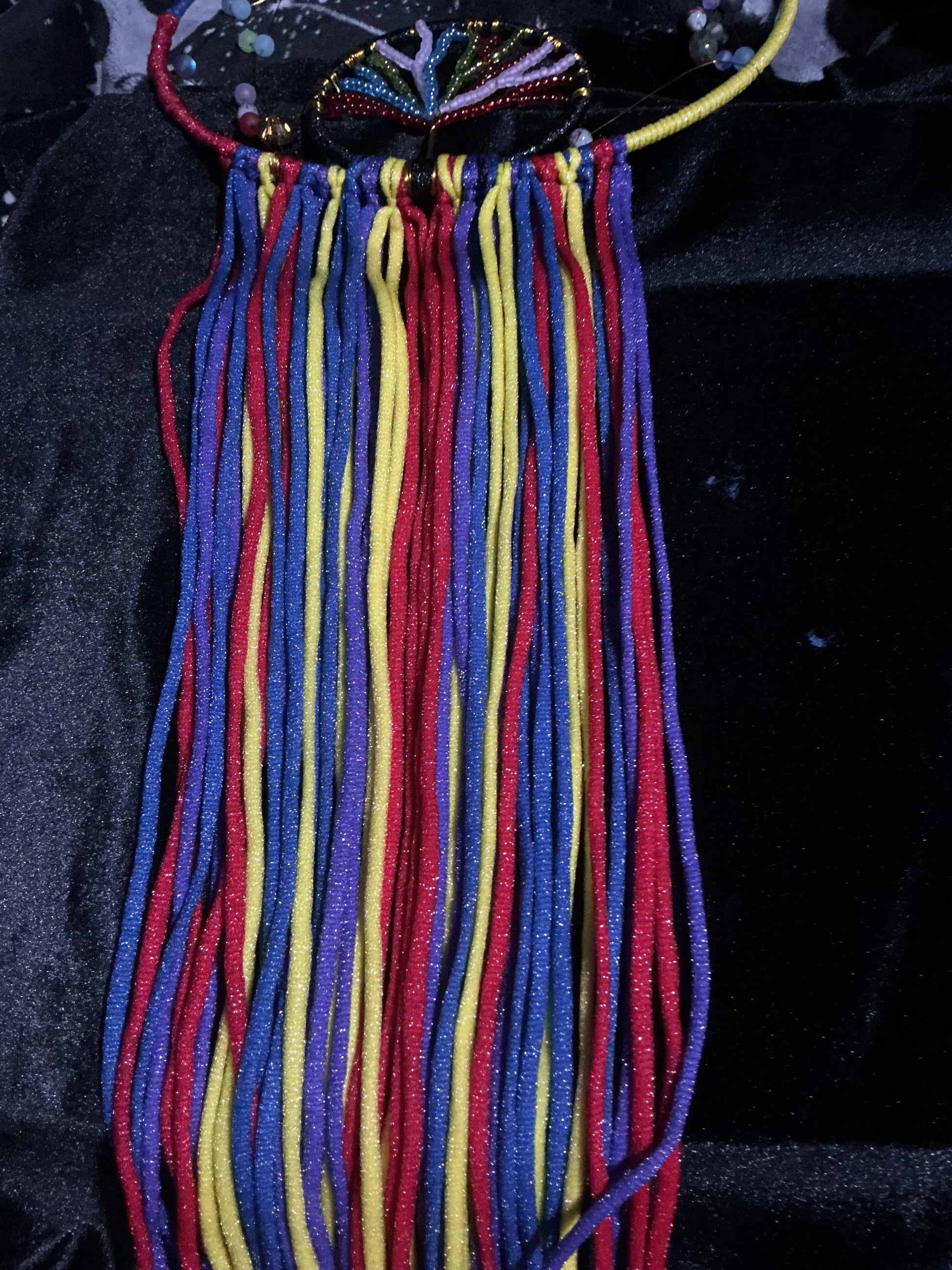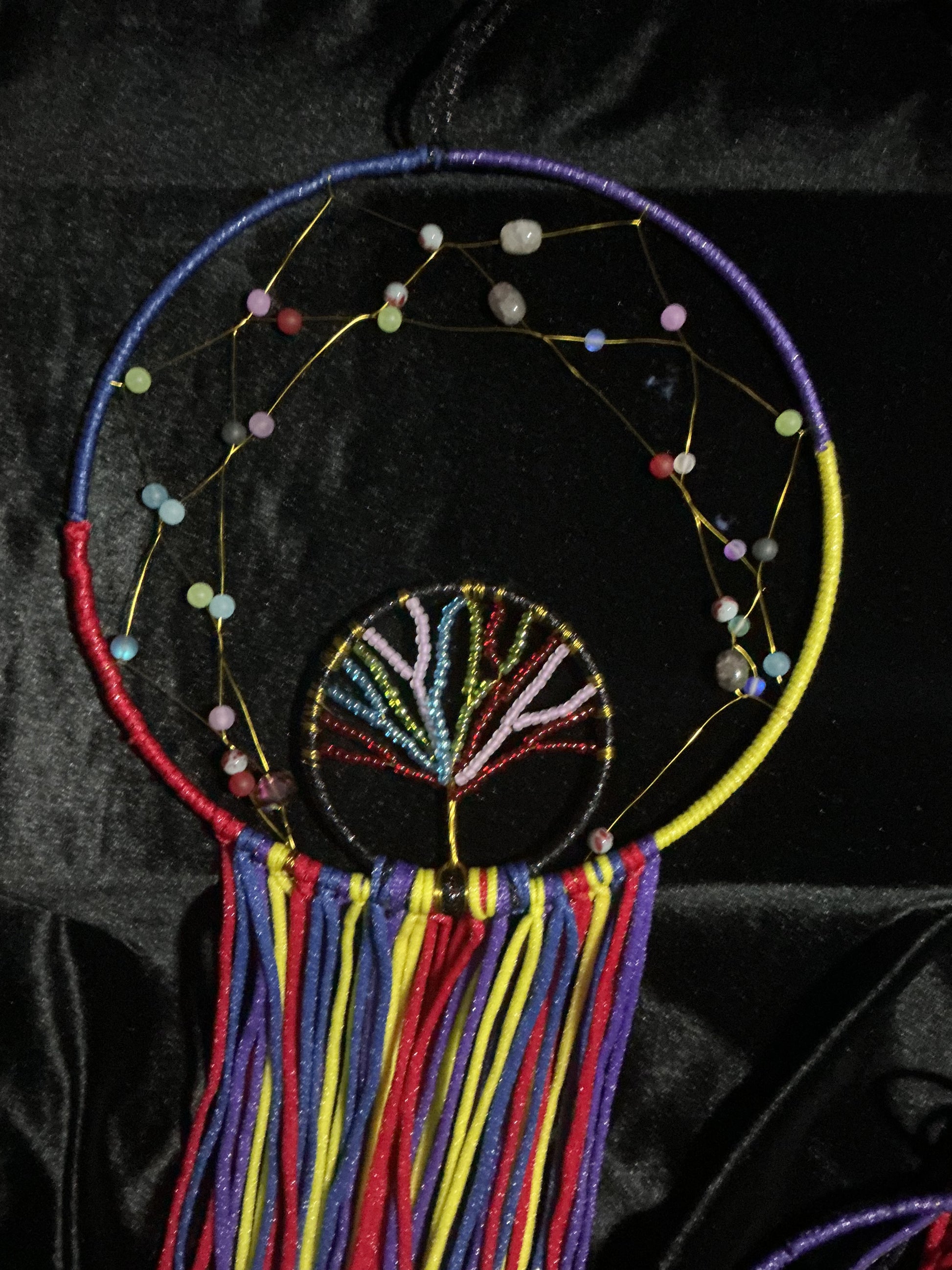 This 12” round circle in circle dreamcatcher features all four colors to represent all four members. The family tree is hand beaded in the signature color glass beads. The tail on this dream catcher is about 15” long.